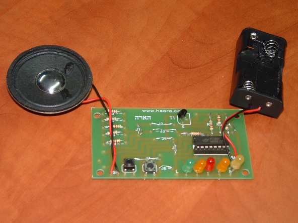 חמישה לדים רצים בצבעים שונים ע”י מעגל משולב ג’וק 16 pin, נגדים, לחצנים ייחודיים, רמקול משולב וסוללת 3V (לא כלולה).